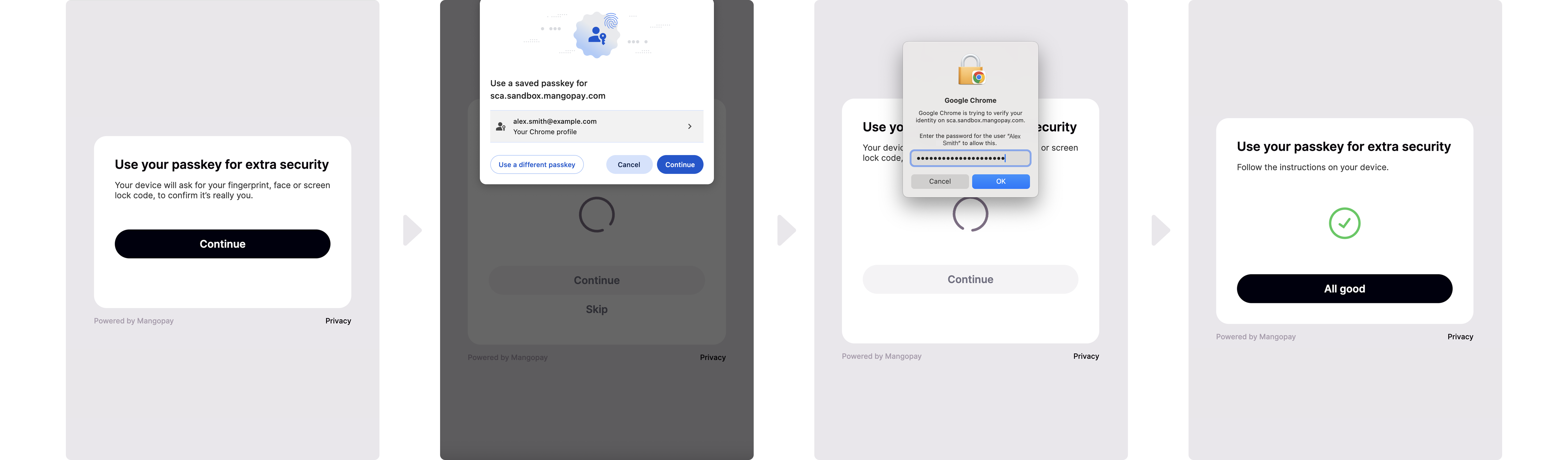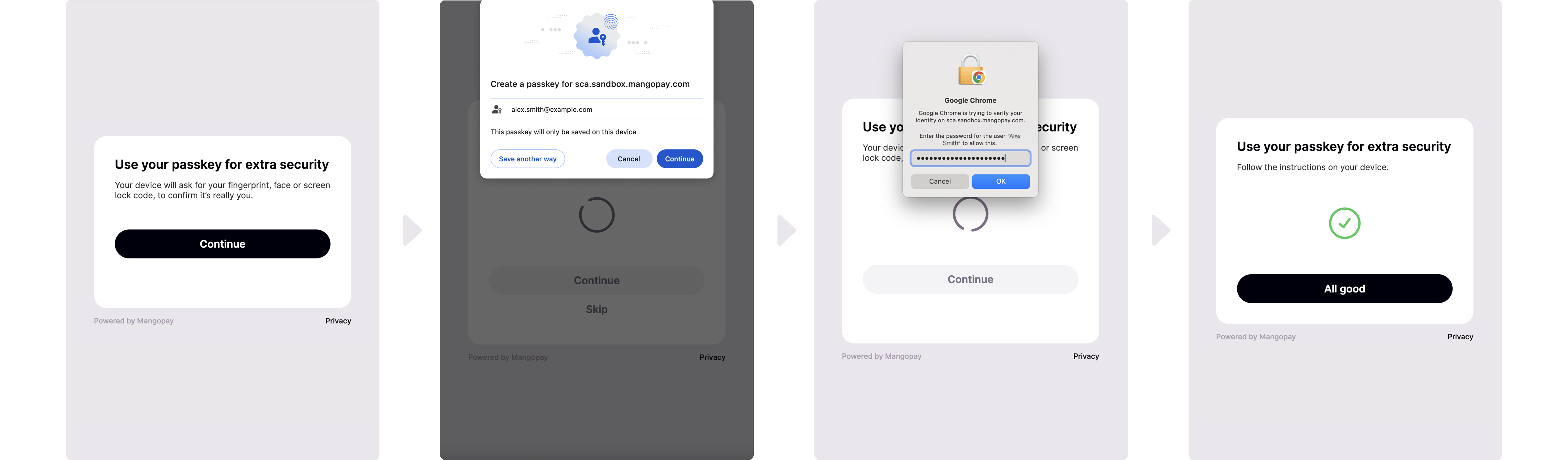 When the user is redirect to a Mangopay SCA session for the first time:- Mangopay analyzes their device to see if it supports WebAuthn passkey. If it does, then the factor enrollment is attempted.