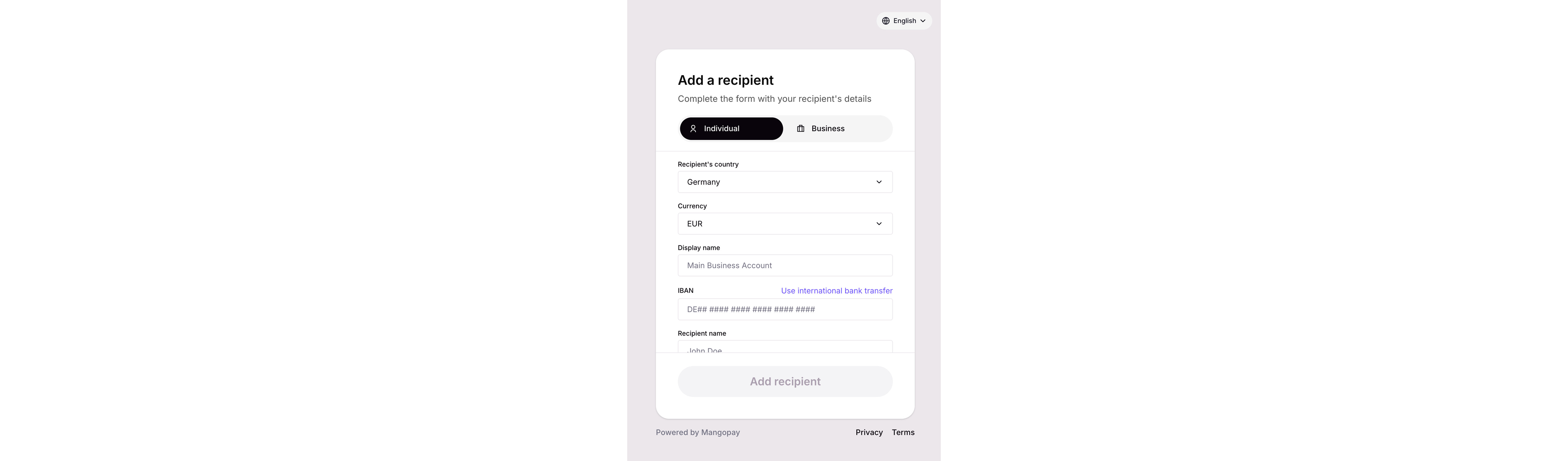 The Recipients experience relies on the Mangopay Elements package. Install the package in your project using your preferred package manager:Integration