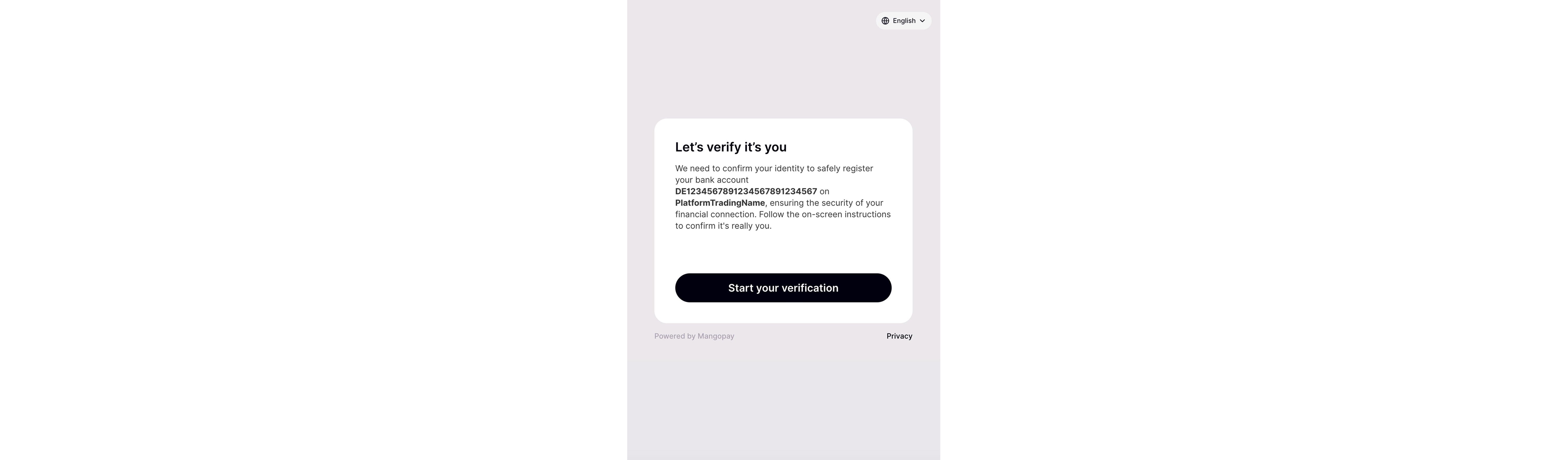 - Leverages Mangopay’s data validation features in real time to ensure the user’s data conforms to the expected local bank account format